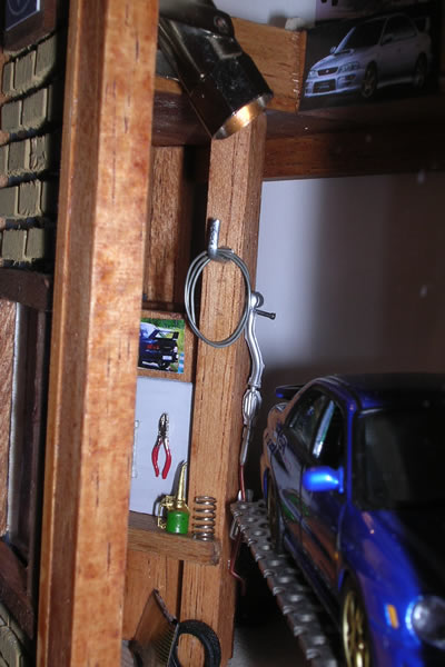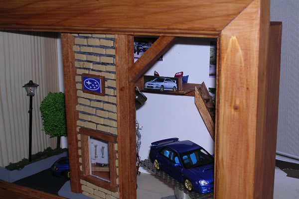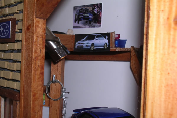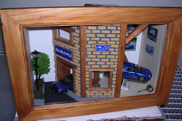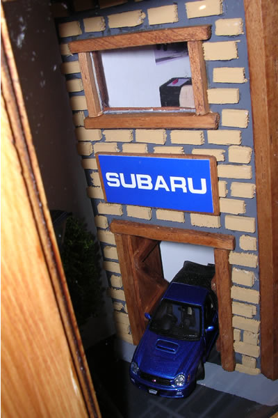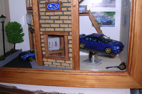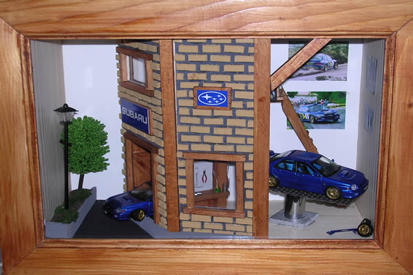 - Une SUBARU est exposée sur le pont élévateur, nombreuses pièces détachées pour compléter l'atelier de réparation.